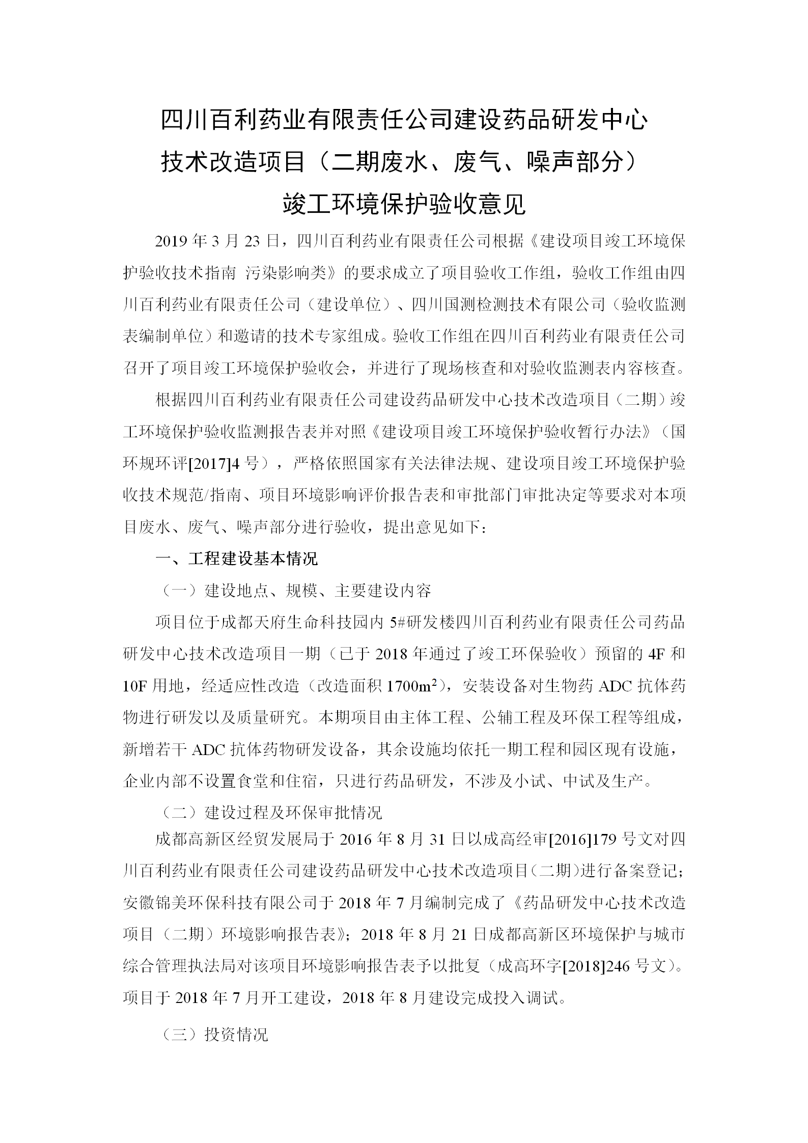 根据《国务院关于建设项目竣工环境保护管理条例的决定》以及环保部《建设项目竣工环境保护验收暂行办法》的公告(国环规环评[2017]4号)现将《四川三亚文博跨境电商物流有限公司有限责任公司药品研发中心技术改造项目(二期)竣工环保验收监测报告》及验收意见公示如下: